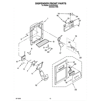 The Ice Dispenser Guide is an OEM replacement part for Whirlpool brand refrigerators. These brands also include Maytag, KitchenAid, Norge, Roper, Estate, and Kenmore models. It directs ice from the ice bucket to the dispenser chute. It helps to prevent jams by guiding the ice through the dispenser system smoothly and evenly.