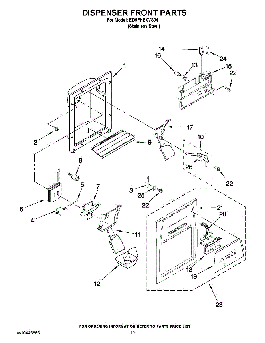 Catches spills from water and ice dispenser. Replace if stained, cracked, or broken. Installs in front dispenser area. Snaps in without tools.