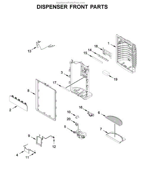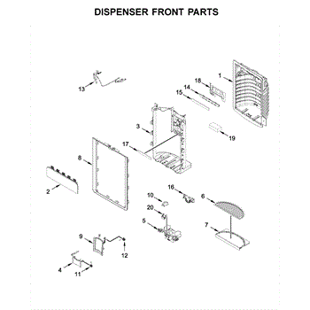 The Dispenser Drip Tray is an OEM part for Whirlpool refrigerators featuring built-in water dispensers. Located underneath the outlet spout, it collects any accidental water overflow or spilled cubes to prevent messes.