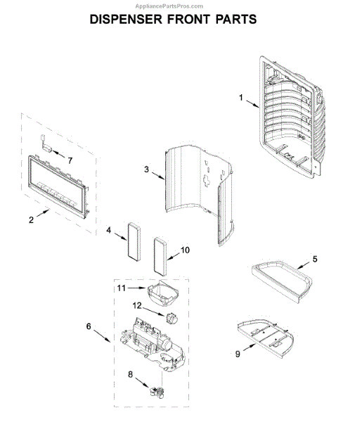 This dispenser separator assembly forms the interior of the refrigerator's ice/water dispensing area. It guides ice and water into your glass and helps seal the chute to limit warm air intrusion, drips, and frost at the opening.