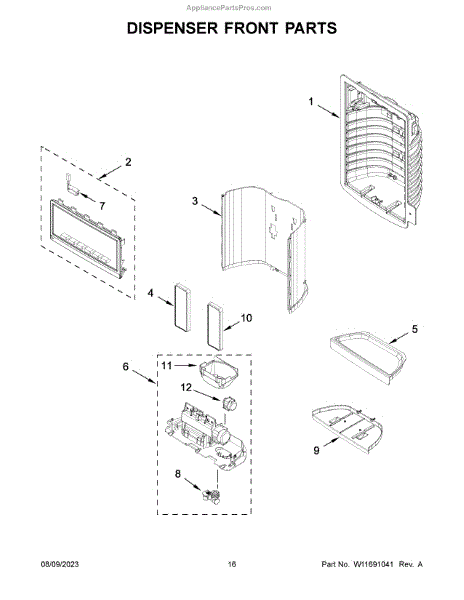 This dispenser separator assembly forms the interior of the refrigerator's ice/water dispensing area. It guides ice and water into your glass and helps seal the chute to limit warm air intrusion, drips, and frost at the opening.