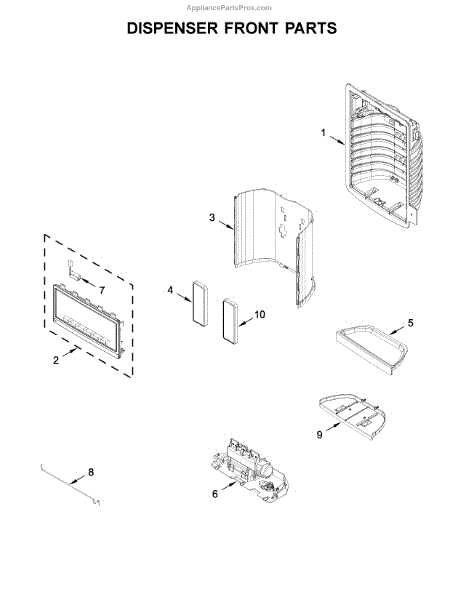 This dispenser separator assembly forms the interior of the refrigerator's ice/water dispensing area. It guides ice and water into your glass and helps seal the chute to limit warm air intrusion, drips, and frost at the opening.
