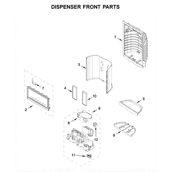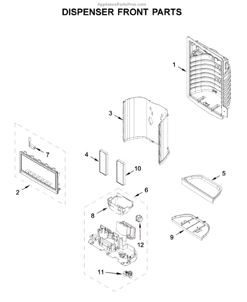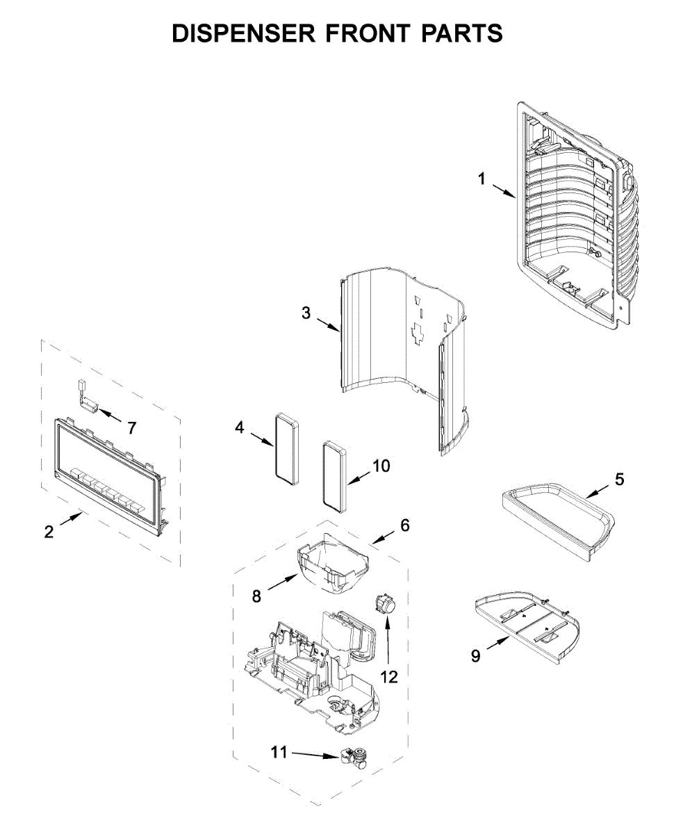 This dispenser separator assembly forms the interior of the refrigerator's ice/water dispensing area. It guides ice and water into your glass and helps seal the chute to limit warm air intrusion, drips, and frost at the opening.
