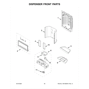 This dispenser separator assembly forms the interior of the refrigerator's ice/water dispensing area. It guides ice and water into your glass and helps seal the chute to limit warm air intrusion, drips, and frost at the opening.