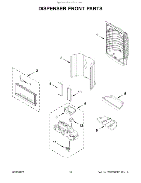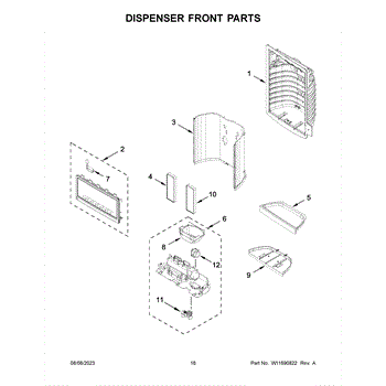 This dispenser separator assembly forms the interior of the refrigerator's ice/water dispensing area. It guides ice and water into your glass and helps seal the chute to limit warm air intrusion, drips, and frost at the opening.