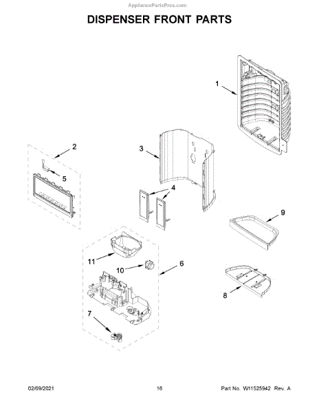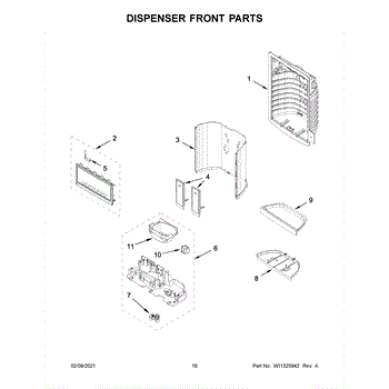 This dispenser separator assembly forms the interior of the refrigerator's ice/water dispensing area. It guides ice and water into your glass and helps seal the chute to limit warm air intrusion, drips, and frost at the opening.