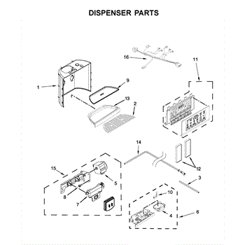The Dispenser Drip Tray is an OEM part for Whirlpool refrigerators featuring internal or through-the-door dispensers. Located below the dispenser mechanism, it collects residual liquid and prevents spills. The drip tray's angled design helps direct any drips into its drainage port.