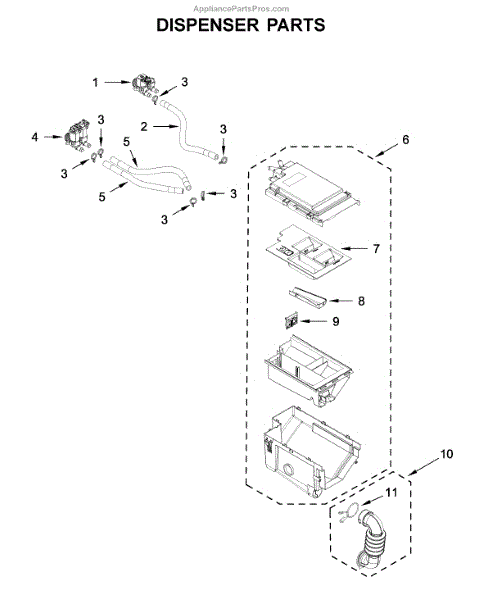 Replacement water hose for washers. Routes water between internal components. Replace if cracked, leaking, clogged, or damaged to restore flow.