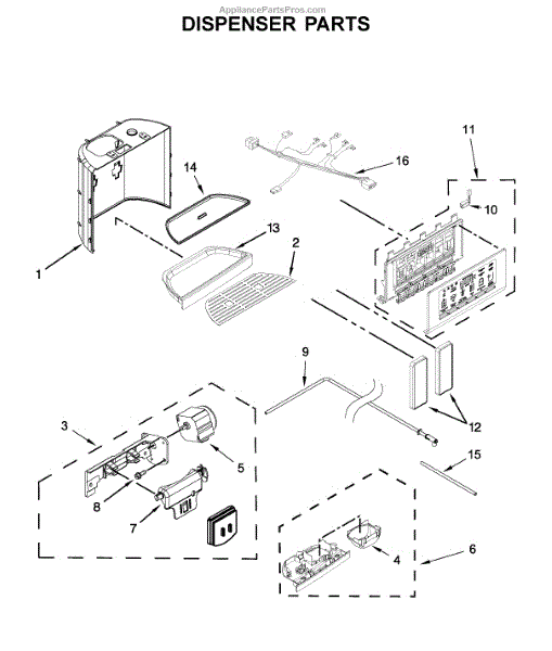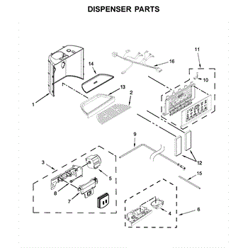 The Dispenser Drip Tray is an OEM part for Whirlpool refrigerators featuring internal or through-the-door dispensers. Located below the dispenser mechanism, it collects residual liquid and prevents spills. The drip tray's angled design helps direct any drips into its drainage port.