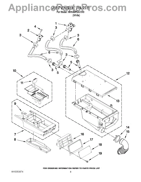 The Dispenser Drawer Assembly is an OEM part for Whirlpool front-loading washing machines. The drawer houses mechanisms that deposit detergent and fabric softener into the drum at the proper times in the wash cycle.