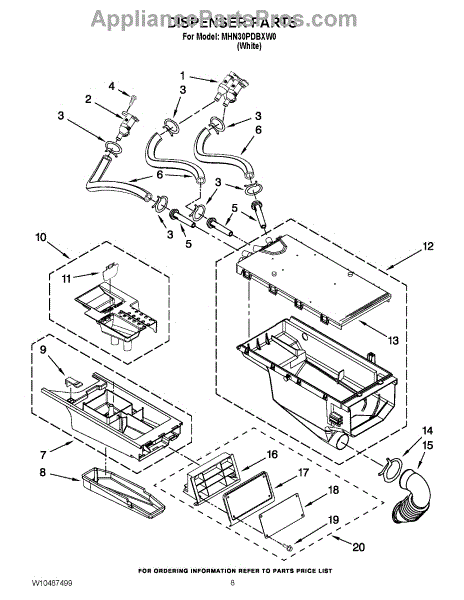 The Dispenser Hose is an OEM replacement part for Whirlpool washing machines. This hose is integral in the detergent dispensing system, channeling liquid detergent and other washing agents from the dispenser to the wash drum. It ensures that cleaning agents are efficiently delivered to the laundry load at the appropriate time during the wash cycle.