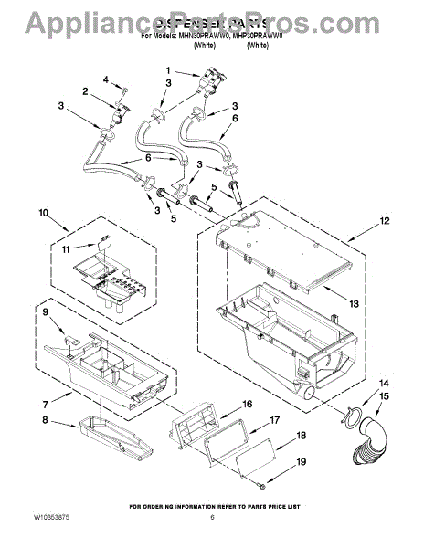 The Dispenser Drawer Assembly is an OEM part for Whirlpool front-loading washing machines. The drawer houses mechanisms that deposit detergent and fabric softener into the drum at the proper times in the wash cycle.