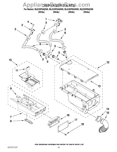 Causes for a malfunctioning Dispenser Hose can include blockages from accumulated detergent residue, cracks or holes in the hose, or issues with the connectors that attach it to the dispenser and drum.