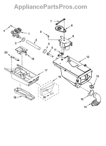 The Detergent Drawer is an OEM part for Whirlpool washing machines. This drawer holds and dispenses detergent, fabric softener, and bleach into the washer at the appropriate times during the wash cycle.