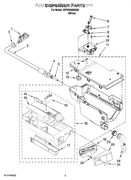 This dispenser drawer slides into the washer's dispenser housing and holds detergent and laundry additives for each cycle. Replace a cracked, stuck, or missing drawer to restore smooth operation and proper dispensing. What it does: