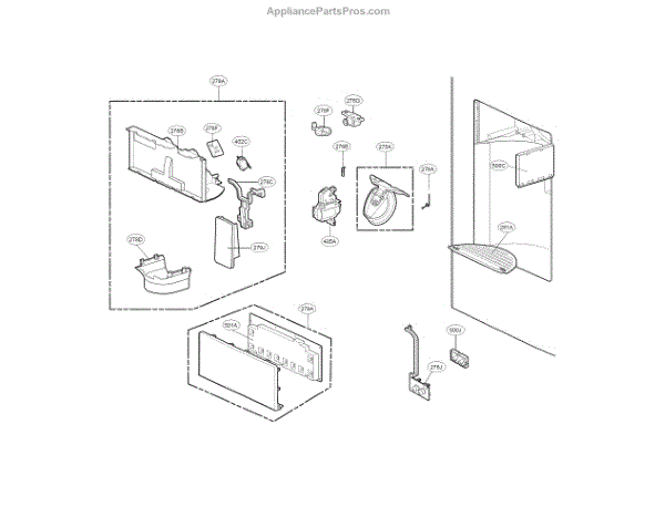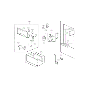 The Dispenser Ice Chute Door is an OEM part for LG side-by-side refrigerators featuring exterior ice and water dispensers. This door guides ice from the storage bin to the access port.