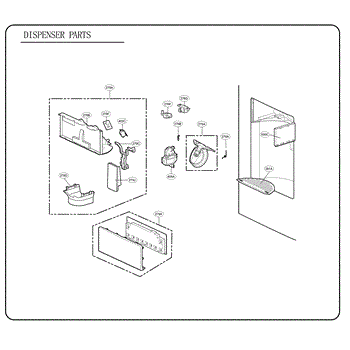 The Dispenser Ice Chute Door is an OEM part for LG side-by-side refrigerators featuring exterior ice and water dispensers. This door guides ice from the storage bin to the access port.