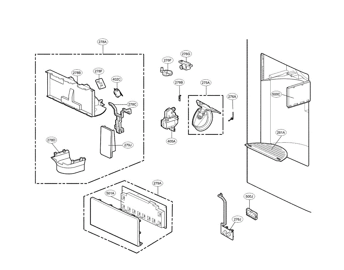 The Dispenser Ice Chute Door is an OEM part for LG side-by-side refrigerators featuring exterior ice and water dispensers. This door guides ice from the storage bin to the access port.