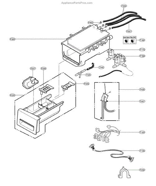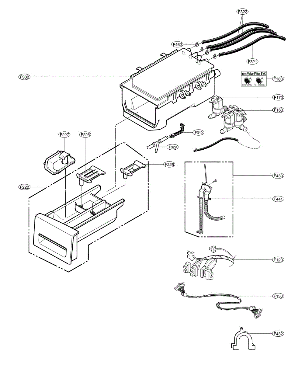 Directs water from inlet valve to detergent dispenser in LG washers. Replace if hose is cracked, leaking, won't stay attached, or damaged from wear.