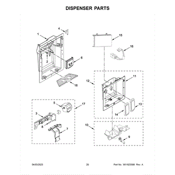 This ice dispenser chute door assembly opens to release ice and closes to help seal the dispenser opening. It helps limit warm air and moisture from entering the freezer so the chute stays clear and dispensing remains reliable.