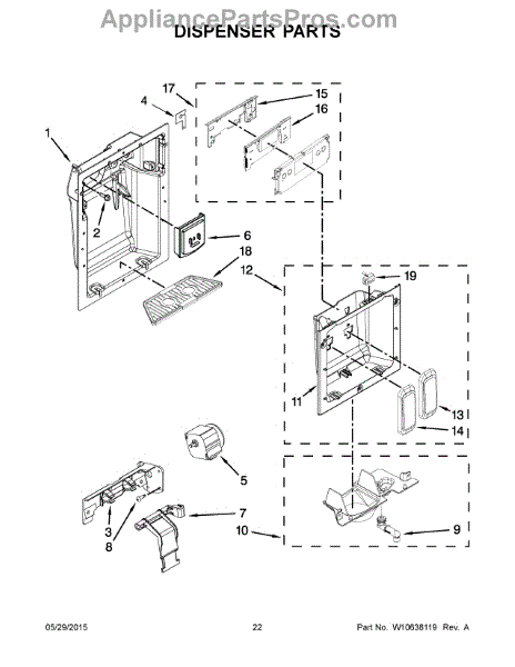 This spigot body assembly routes water from the refrigerator supply to the dispenser and replaces a worn, cracked, or leaking dispenser spigot. It restores proper water flow and helps stop drips or visible leaks at the dispenser. What it does: