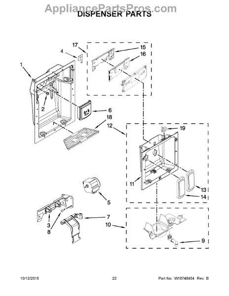 This spigot body assembly routes water from the refrigerator supply to the dispenser and replaces a worn, cracked, or leaking dispenser spigot. It restores proper water flow and helps stop drips or visible leaks at the dispenser. What it does: