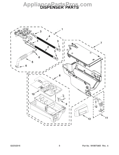 The Washer Dispenser Drawer is an OEM replacement part for Whirlpool washing machines. It is a removable compartment designed to hold and dispense detergent, fabric softener, and other laundry additives during the wash cycle.