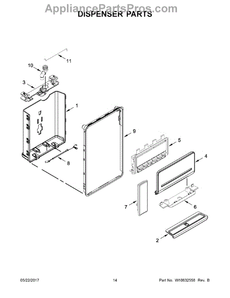 This dispenser trim is the exterior bezel that finishes the refrigerator dispenser opening, restoring a clean appearance and helping align the dispenser components for smooth operation. What it does: