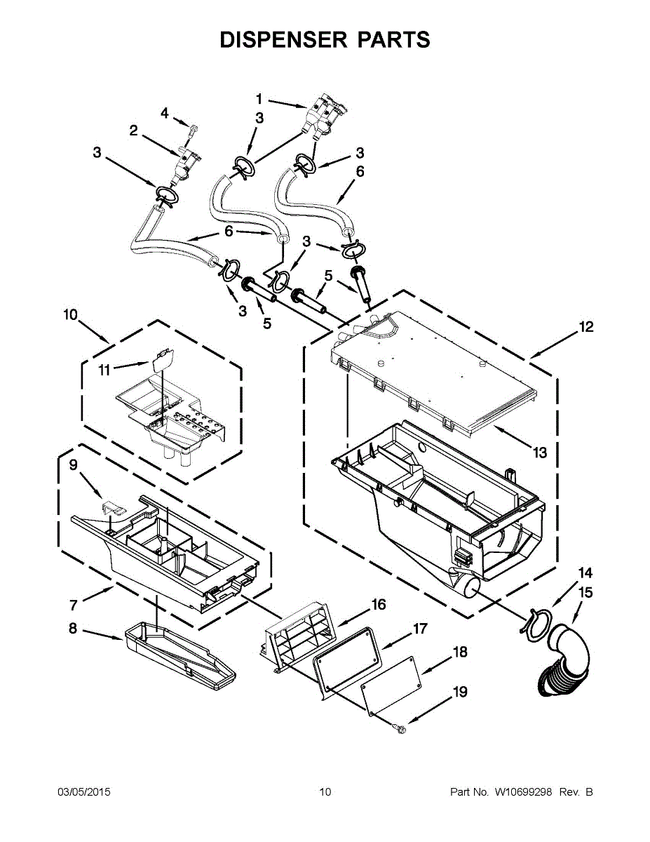 Causes for a malfunctioning Dispenser Hose can include blockages from accumulated detergent residue, cracks or holes in the hose, or issues with the connectors that attach it to the dispenser and drum.