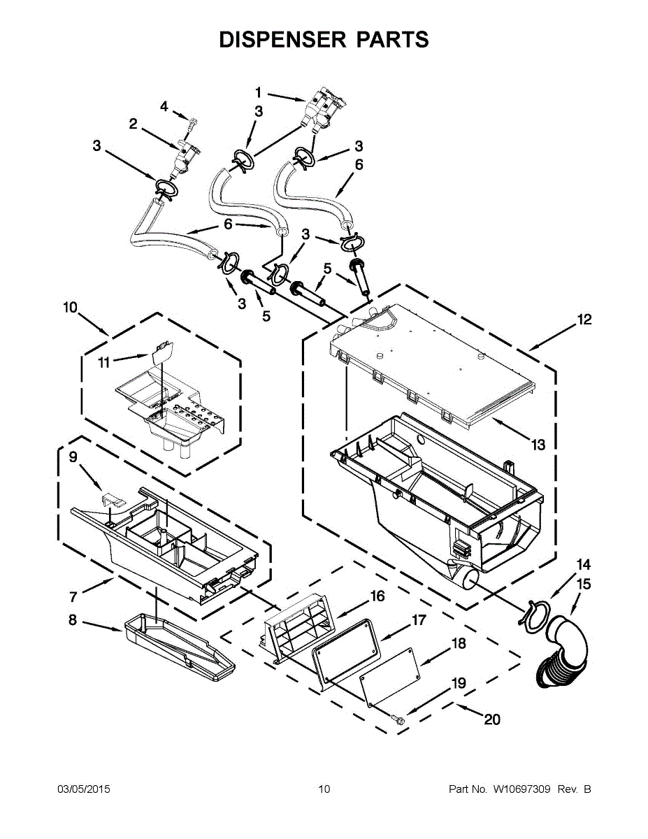 Causes for a malfunctioning Dispenser Hose can include blockages from accumulated detergent residue, cracks or holes in the hose, or issues with the connectors that attach it to the dispenser and drum.