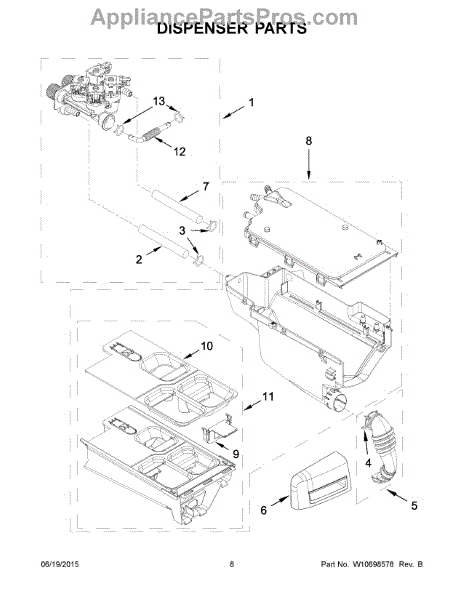 The Washer Dispenser Drawer is an OEM replacement part for Whirlpool washing machines. It is a removable compartment designed to hold and dispense detergent, fabric softener, and other laundry additives during the wash cycle.