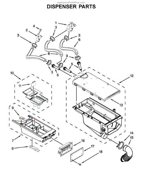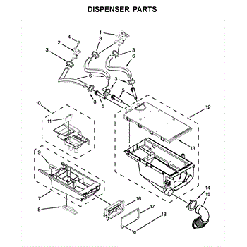 The Dispenser Drawer Assembly is an OEM part for Whirlpool front-loading washing machines. The drawer houses mechanisms that deposit detergent and fabric softener into the drum at the proper times in the wash cycle.