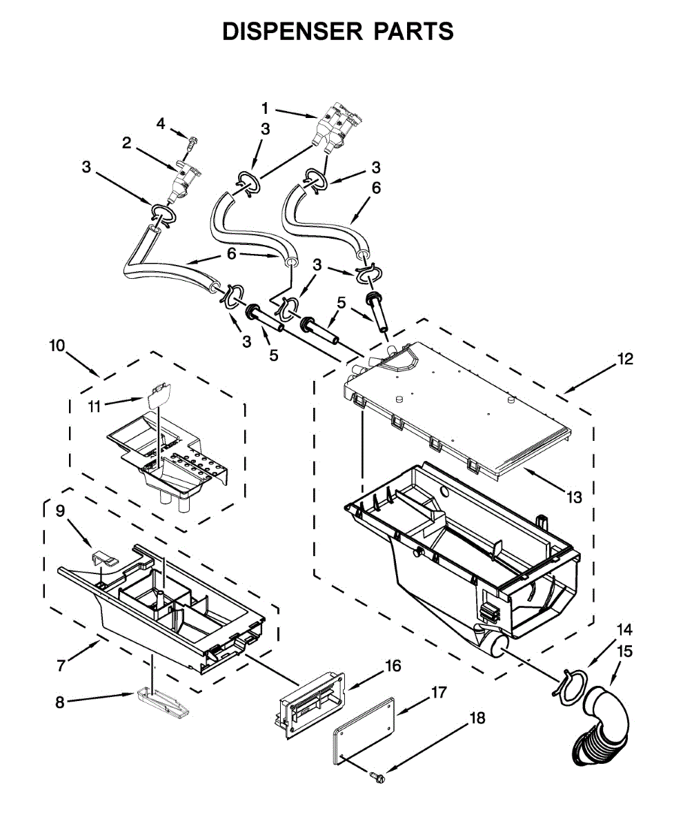 Causes for a malfunctioning Dispenser Hose can include blockages from accumulated detergent residue, cracks or holes in the hose, or issues with the connectors that attach it to the dispenser and drum.