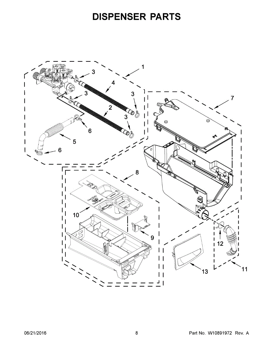The Washer Dispenser Drawer is an OEM replacement part for Whirlpool washing machines. It is a removable compartment designed to hold and dispense detergent, fabric softener, and other laundry additives during the wash cycle.