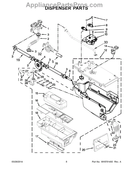 This dispenser drawer holds and guides detergent, bleach, and fabric softener into the washer at the correct cycle time. Replacing a worn drawer helps prevent leaks, residue buildup, and improper dispensing that can affect wash results.