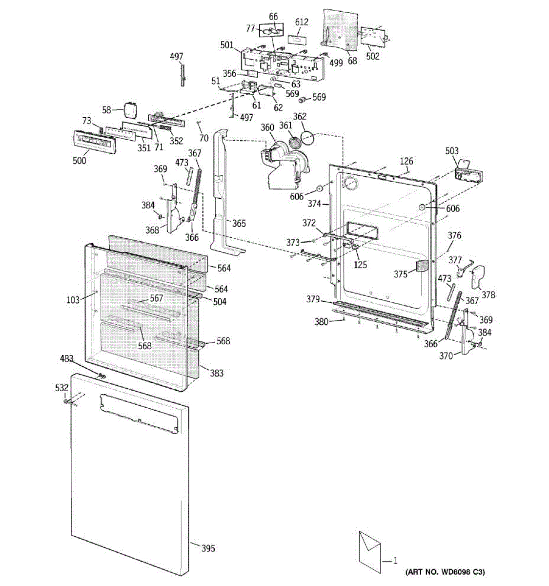 Upper door insulation for dishwashers. Installs inside the door panel to dampen sound and retain heat. Replace if torn, compressed, or missing.