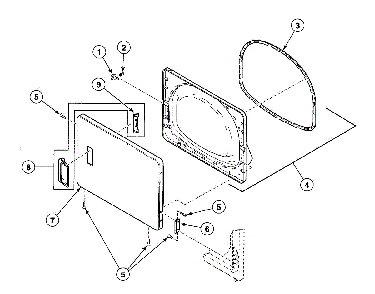 Complete dryer door assembly that mounts to the front panel. Replace if your door is cracked, damaged, or won't close properly. Includes hinges and latch.