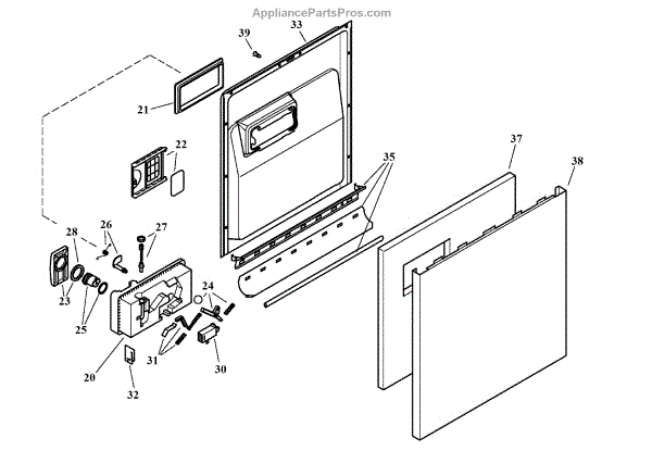 This outer door is the dishwasher's exterior front panel that restores the appliance's appearance and protects internal components from damage. It provides a finished look and replaces dented, scratched, or corroded panels. What it does
