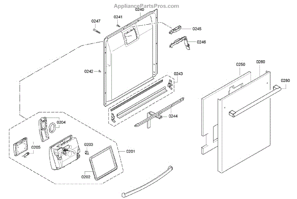 This inner door panel replaces a damaged or worn dishwasher door interior to restore proper door fit and help prevent leaks and rattling. It fits behind the outer door and supports the latch and internal components. What it does