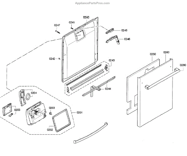 This inner door panel replaces a damaged or worn dishwasher door interior to restore proper door fit and help prevent leaks and rattling. It fits behind the outer door and supports the latch and internal components. What it does