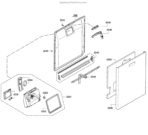 This inner door panel replaces a damaged or worn dishwasher door interior to restore proper door fit and help prevent leaks and rattling. It fits behind the outer door and supports the latch and internal components. What it does