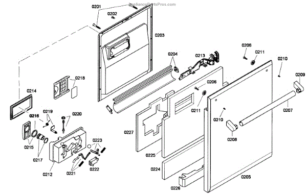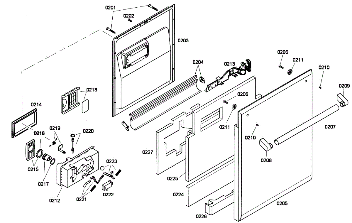 Interior panel for dishwasher door that protects components and provides a finished surface. Replace if cracked, dented, or damaged to restore sealing.