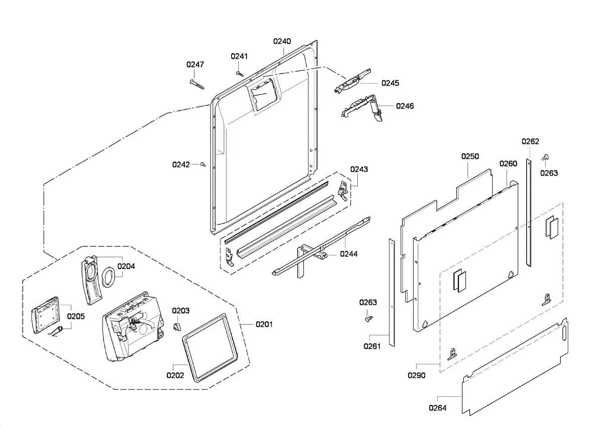 This inner door panel replaces a damaged or worn dishwasher door interior to restore proper door fit and help prevent leaks and rattling. It fits behind the outer door and supports the latch and internal components. What it does