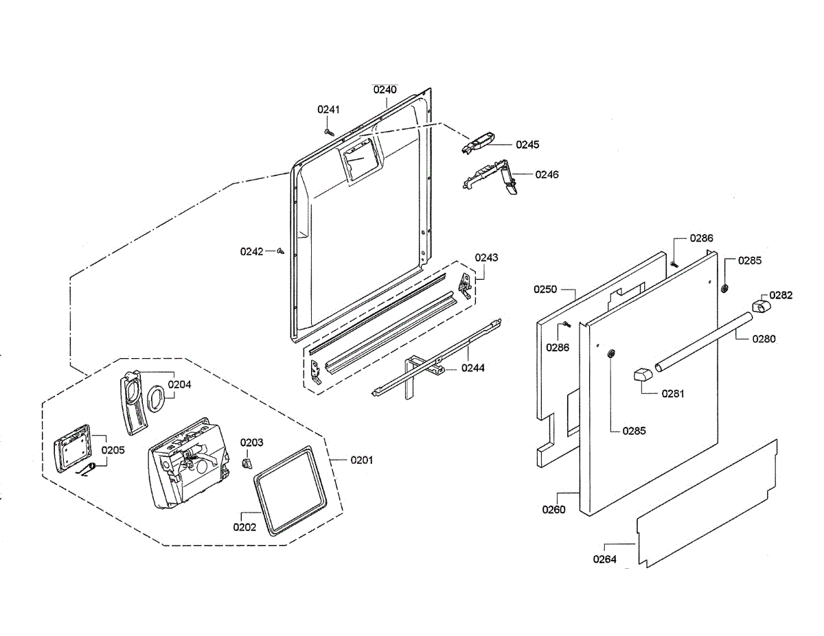 This inner door panel replaces a damaged or worn dishwasher door interior to restore proper door fit and help prevent leaks and rattling. It fits behind the outer door and supports the latch and internal components. What it does