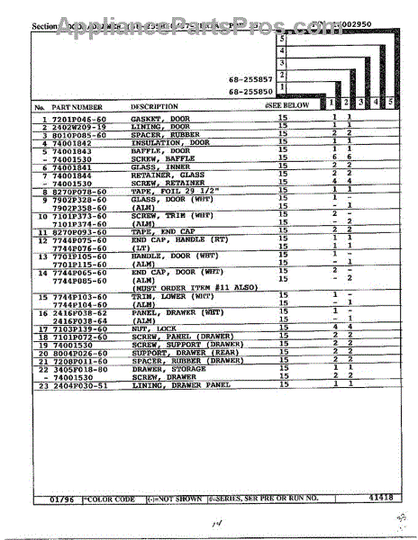 This factory screw secures appliance components to their mounting points. Replace missing, worn, or stripped hardware to restore a tight fit, proper alignment, and quieter operation across the affected assembly.