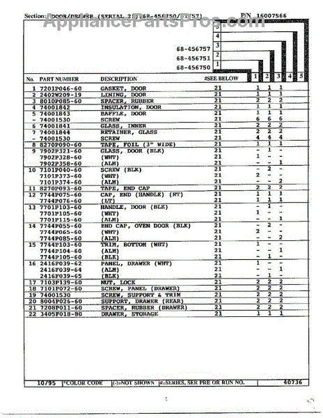 This factory screw secures appliance components to their mounting points. Replace missing, worn, or stripped hardware to restore a tight fit, proper alignment, and quieter operation across the affected assembly.