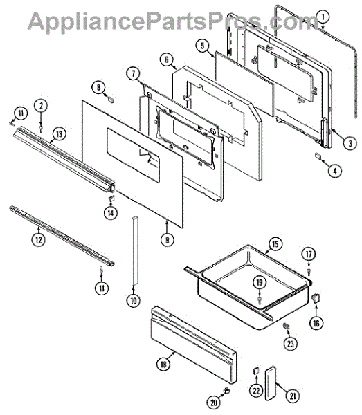 Rear broiler drawer support for ranges. Replaces cracked, broken, or worn drawer supports. Structural part that mounts under the broiler drawer compartment.