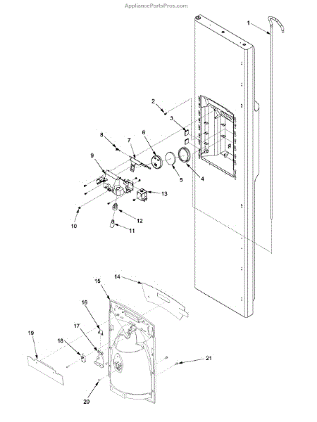 The Ice Chute Door is an OEM replacement part for Whirlpool side-by-side refrigerators. It provides access to the dedicated ice and water storage and dispensing compartment located on the refrigerator door.