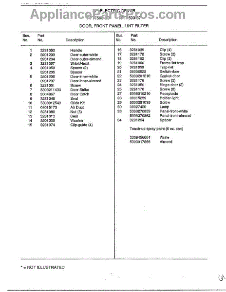 Parts for Frigidaire 7599-87: Door, Front Panel, Lint Filter Page 2 Parts