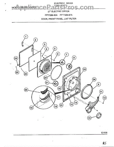 Parts for Frigidaire 7289-80A: Door, Front Panel, Lint Filter Parts